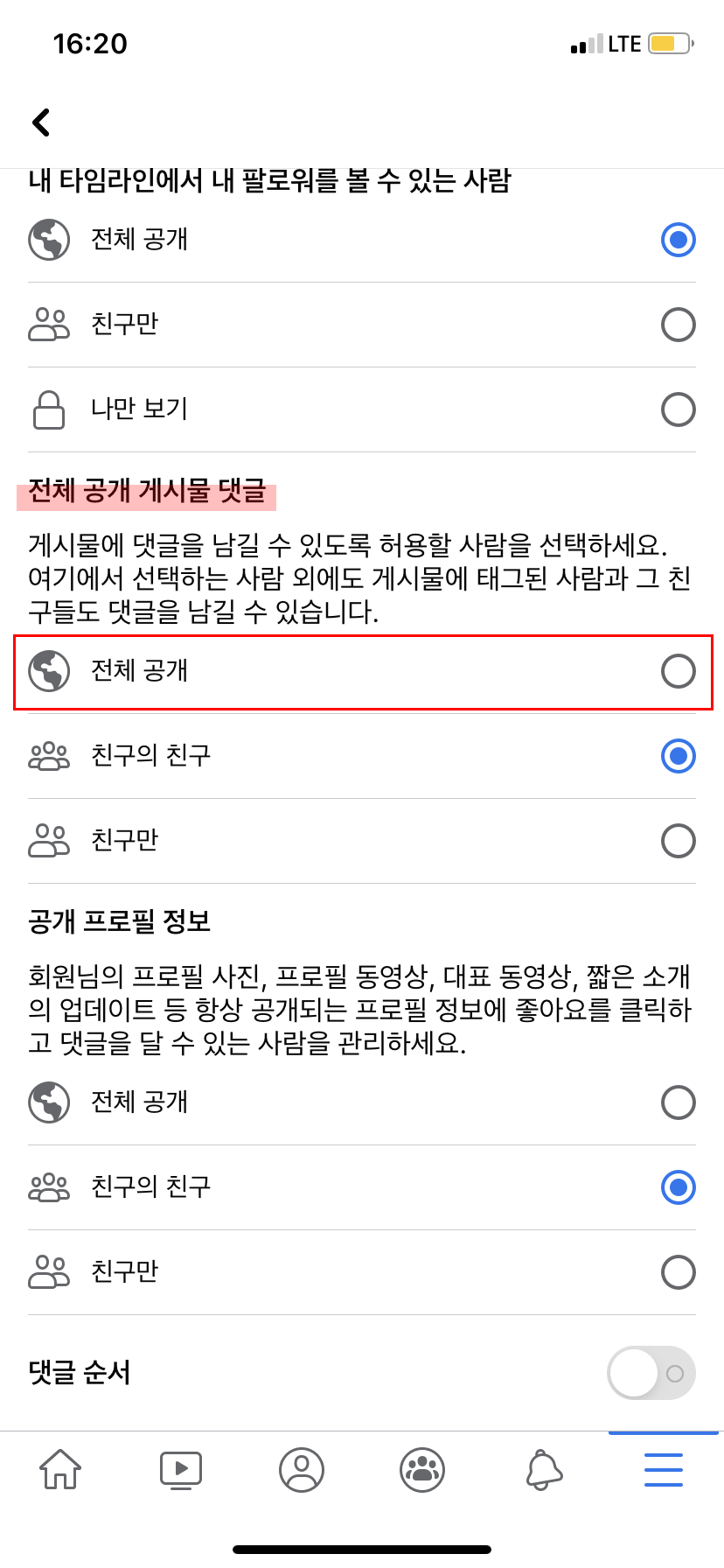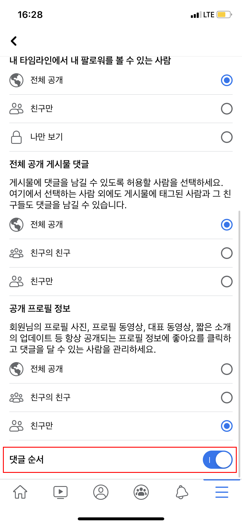 약간 TMI일 순 있겠지만 설정을 마친 후에 그 밑의 메뉴를 주목해보자. 그럼 '공개 프로필 정보'라는 메뉴가 있는데, 거기서 '댓글 순서' 메뉴를 주목해보자. 기본 설정은 활성화되어 있지 않으나, 활성화를 시키면 댓글의 순서가 자신과 관련된 분들의 순서로 나오게 된다. 이렇게 될 경우 결국 또다시 그 전의 상황과 돌아가는 것이 아니냐 의문을 가질 수 있다.