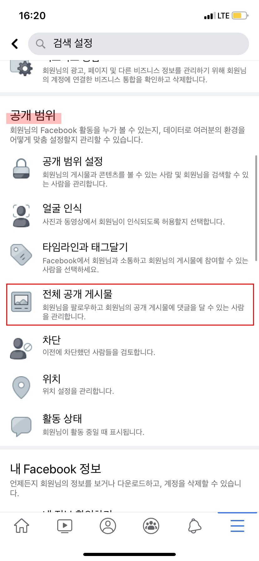 그럼 공개 범위에 대한 다양한 설정 편집을 할 수 있는 화면이 나온다. 거기서 조금만 스크롤을 내려보자. 그럼 '공개 범위'라는 카테고리에 '전체 공개 게시물'이라는 메뉴가 보일 것이다. 이것이 우리가 찾는 메뉴니 서둘러 탭 하도록 하자.