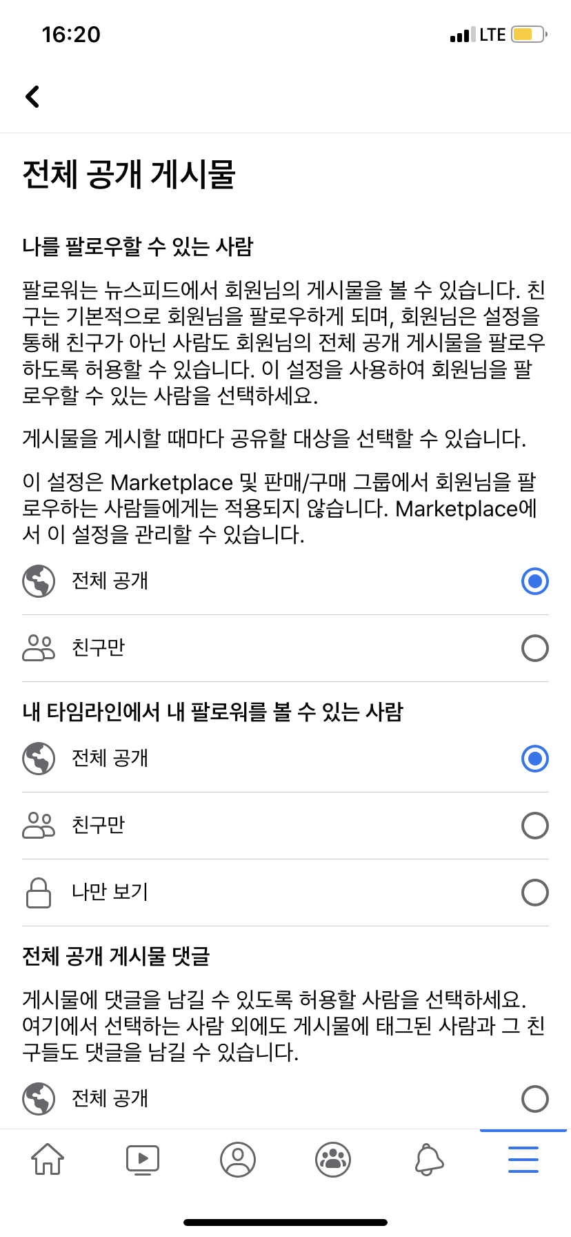 '전체 공개 게시물' 메뉴에서는 말 그대로 내 게시물, 혹은 상대방의 게시물에 대하여 내 게시물 혹은 댓글이 상대에게 어떻게 공개될지 그 범위를 정할 수 있는 메뉴다. 아까 댓글 안보임 현상이 발생하는 원인이 본인 계정을 중심으로 한 관련도 순, 혹은 게시물과 관련된 순으로 나열된다고 했다. 그렇기 때문에 이 메뉴에서 편집만 잘한다면 댓글 안보임 현상은 없어질 것이다.
