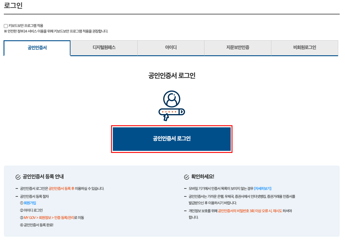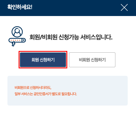 조금 번거로울 수 있지만 정부24 사이트의 유일한 단점이 아닐까 한다. 바로 '회원가입'이 필수적이라는 것이다. 물론 비회원으로 신청이 가능하다. 하지만 어떤 민원이건 대부분 '공인인증서'를 사용해야 하기 때문에 본의 아닌 회원가입을 하게 되는 경우가 있을 것이다. 따라서 간편하게, 그리고 스무스하게 작업을 처리하고자 한다면 미리 공인인증서를 발급받은 후 정부24 사이트 회원가입을 마무리해두는 게 좋다. 필자의 경우 진작에 가입을 하고, 발행도 해놨으니 회원으로 신청하도록 하겠다.