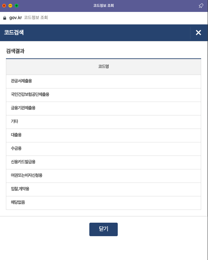 '용도' 메뉴 란에서는 필자가 별도로 기입을 하는 것이 아닌 선택을 해주면 된다. 바로 옆에 있는 '검색' 버튼을 클릭해보자. 그럼 대략 7-8가지 정도의 용도가 등장한다. 관공서 제출용이나, 대출, 건강보험 쪽에 제출하려고 한다면 해당 용도에 맞게 발급을 해주는 듯하다. 필자의 경우 별도의 해당되는 항목이 없기에 제일 하단의 '해당 없음' 버튼을 클릭했으나, 여러분들의 경우 위의 항목과 일치하는 항목이 있다면 해당 용도대로 클릭하여 진행하기 바란다.