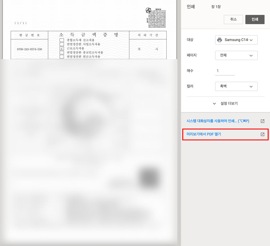 소득금액증명원 인터넷 발급 PDF로 다운로드하는 방법은 간단하다. 어찌 보면 편법일 수 있는데 '인쇄'시 나오는 내용의 허점을 이용하는 것이다. 일단 모든 신청이 끝난 후에 '문서 출력하기' 버튼을 누르게 되면 중간의 사진처럼 인쇄창이 등장한다. 그리고 우측 상단의 '인쇄' 버튼을 클릭하면 우측 사진과 같이 인쇄하기 창이 등장하는데, 여기서 잘 봐야할 것은 우측 하단에 보면 '미리보기에서 PDF 열기'라는 항목이 존재한다. 즉 해당 항목을 PDF 파일로 변환하여 미리보기 형태로 등장시킨다는 것이다. 미리보기로 등장하게 되면 바로 '저장하기' 버튼을 눌러주면 PDF 파일로 다른 이름 저장이 가능해진다. 이렇게 하면 인터넷 발급과 함께 PDF 다운로드도 마무리된다.