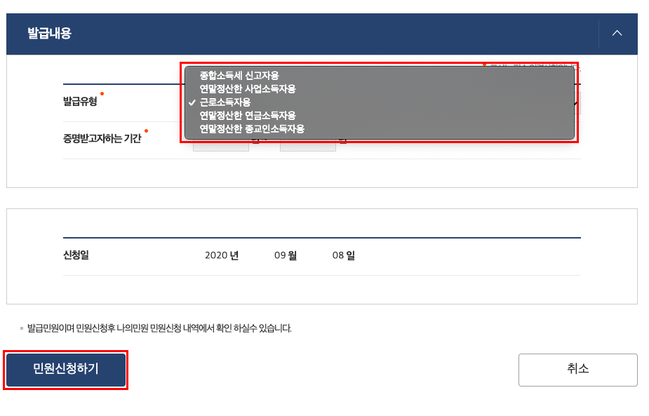 그리고 '발급 내용' 칸을 주목해보자. 발급 내용 칸에는 발급 유형과 증명받고자 하는 기간이 존재한다. 발급 유형은 위 사진과 같이 '종합소득세 신고자용' / '연말 정산한 사업소득자용' / '근로소득자용' / '연말 정산한 연금소득자용' / '연말 정산한 종교인 소득자용'으로 총 5가지가 있다. 여기서 본인이 원하는 바에 체크만 해주면 된다.