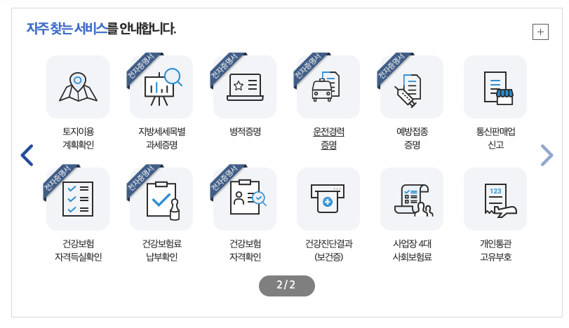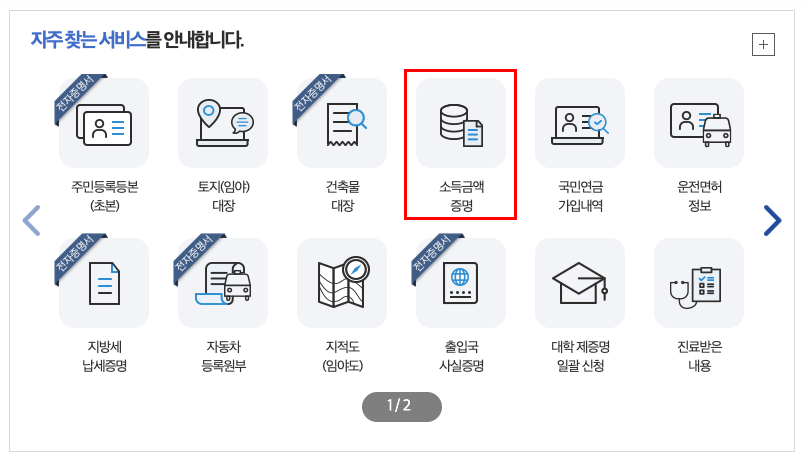 사이트 메인 화면 중간을 주목하면 '자주 찾는 서비스'라는 카테고리에 총 24가지 정도의 민원 처리 서비스 항목이 등장한다. 사람들이 많이 찾는다는 항목인데, 우리에게 필요한 소득금액증명원과 함께, 주민등록초본, 건축물 대장, 운전면허 정보, 4대 보험, 개인통관고유부호 등 다양한 민원 서비스들이 존재한다. 일단 오늘은 우리가 찾고자 하는 서비스만 신청을 하고자 하지만, 만약 여러분들이 보고 필요한 서류나 민원 서비스가 존재한다고 하면 해당 카테고리를 꼭 참고해보면 좋을 듯싶다.