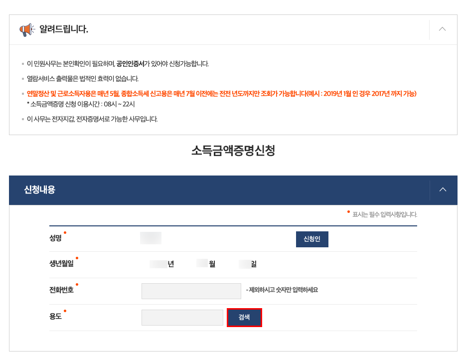 증명 받고자 하는 기간의 경우 자신이 원하는 기간을 자유롭게 기입해주면 된다. 예를 들면 2018년 ~ 2019년 이런 식으로 가능하다. 단, 주의해야 할 점은 현재 시점에서 1년 전까지의 시점만 가능하다고 한다. 즉 2020년은 제외한 2019년까지의 소득금액증명원 인터넷 발급이 가능하다는 것이니 이 점 참고하기 바란다. 그리고 모든 정보가 기입이 되었다면 좌측 하단의 '민원 신청하기' 버튼을 클릭하자.