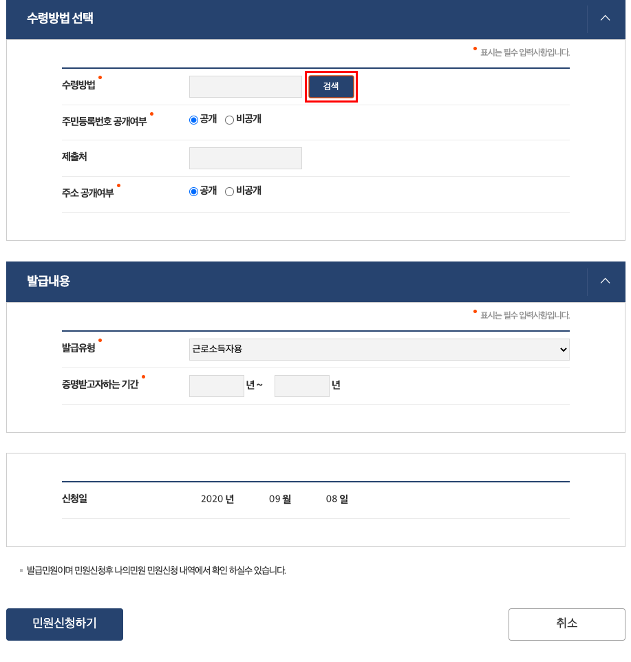 그 다음에 기입해야 할 정보는 수령 방법과 발급 내용에 관한 것이다. 먼저 수령 방법의 경우를 보도록 하겠다. 일단 주민등록번호와 주소 공개 여부란에 공개를 할 것인지, 비공개로 할 것인지를 묻는다. 이는 본인의 개인정보와 관련 있는 부분이니 알아서 처리하는 것이 바람직할 것이다. 그리고 '제출처'의 경우 제출하고자 하는 곳의 이름을 써주면 된다.