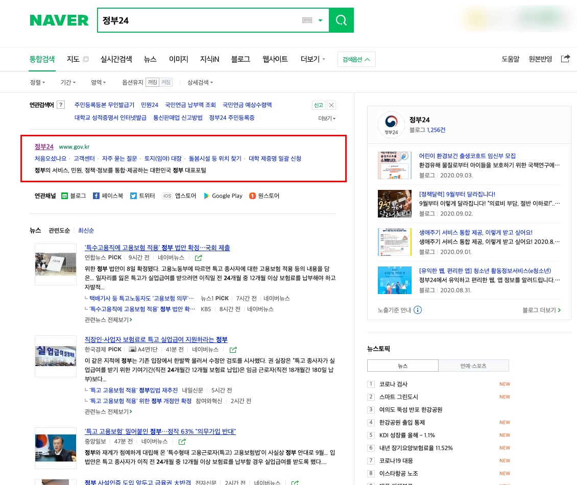 혹여나 모르시는 분들을 위해 설명해보도록 하겠다. 먼저 인터넷 검색 포털 사이트에 접속하여 검색창에 '정부24'라고 검색을 해보자. 그럼 최상단에 정부24 사이트가 등장하는데, 해당 URL을 클릭하여 접속해보도록 하자. 그럼 우측 사진처럼 메인화면이 등장하며, 민원에 필요한 각종 서비스들이 등장한다. 하지만 굳이 검색을 해서 접속하기 귀찮다고 하신다면, 특히 이 글을 보고 계신 독자분들을 위해 필자가 아래에 정부24 사이트 URL을 첨부해두었으니 해당 URL을 클릭하여 접속하기 바란다.
