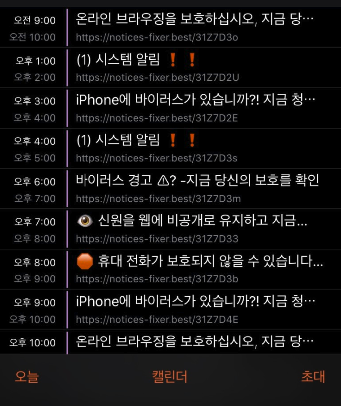 주된 증상은 캘린더 알람으로 위와 같은 내용이 거의 시간 단위로 울리게 된다. 내용은 동일하게 아이폰(혹은 컴퓨터) 보호를 하자, 혹은 청소하자와 같은 내용이 대부분이다. 그리고 확인해보면 'Click Subcribe'라는 구독하지도 않은 것들이 아이폰 캘린더 구독으로 되어 있어 이렇게 알림이 수시로 울리게 된다. 어떻게 하면 아이폰 캘린더 구독 취소와 함께 아이폰 캘린더 바이러스 삭제까지 한 번에 해볼 수 있을까? 사실 방법은 매우 간단하다!