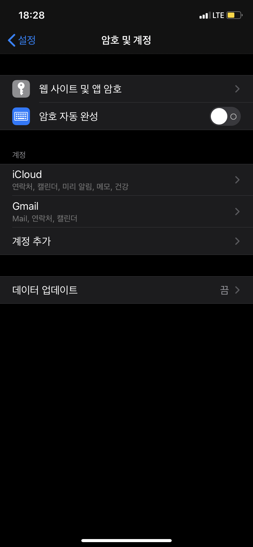 암호 및 계정의 경우 내 아이폰(혹은 Gmail, iCloud 등)의 계정에 대한 관리를 할 수 있다. 더불어 우리가 원하는 캘린더 구독에 대한 부분도 이 곳에서 다룰 수 있고, 편집할 수도 있다. 암호 및 계정 메뉴로 들어오면 위와 같이 소박하게 하위 메뉴들이 구성되어 있는데, 그 중 '계정' 카테고리를 주목해보자. 그럼 거기에 '구독한 캘린더'라는 항목이 보일 것이다.