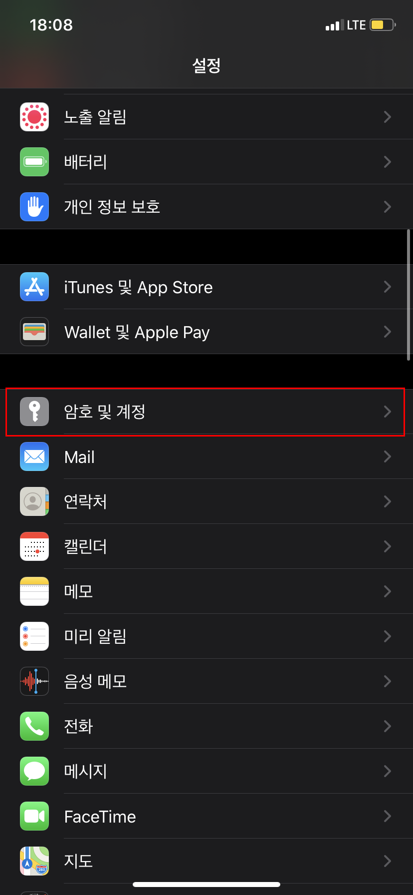 그럼 본격적으로 아이폰 캘린더 구독 취소를 해보도록 하자. 일단 아이폰의 고유한 기능에 대한 편집이 필요하기 때문에 배경화면에 있는 '설정' 어플을 탭 하여 실행시켜 주도록 하자. 실행 후에 스크랩을 조금 내려다보면 열쇠 모양의 아이콘과 함께 '암호 및 계정'이라는 메뉴가 보일 것이다. 해당 메뉴를 탭 해주고 실행해보자.