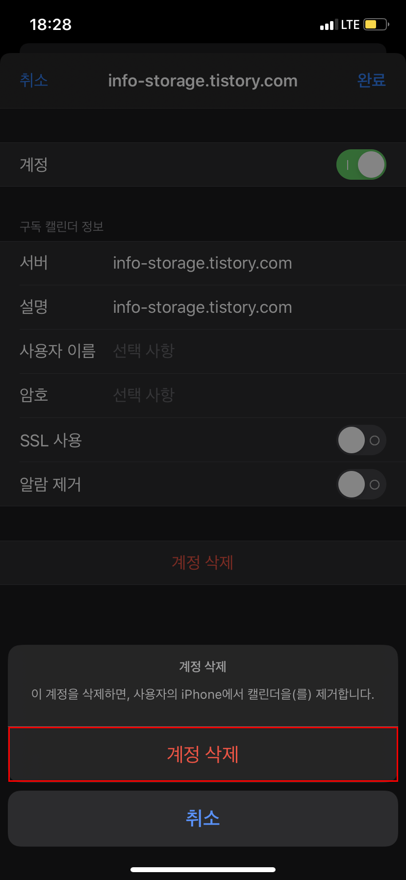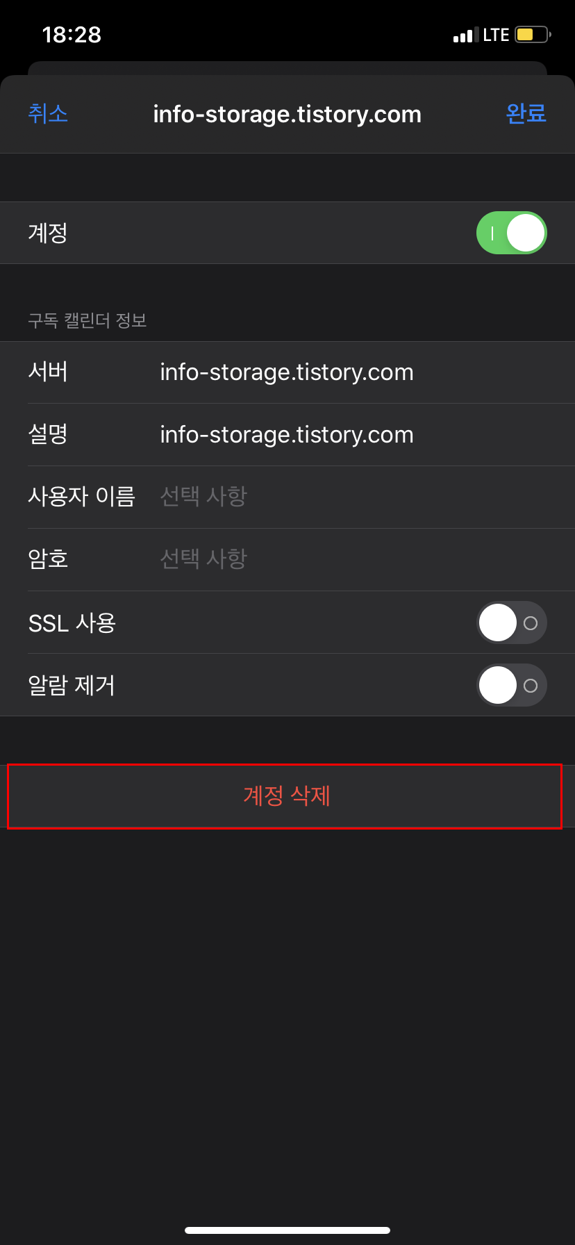 해당 항목의 경우 필자가 예를 들기 위하여 하위 설명에 필자의 블로그 URL을 기입해놓은 것을 가안으로 만들어 두었다. 하지만 위와 같이 아이폰 캘린더 바이러스 현상이 나타나는 경우 'Click Subcribe~'라는 형식의 설명이 보일 것이다. 해당 내용으로 구독된 캘린더에 세팅되어 있다면 아이폰 바이러스(라 쓰고 백신 프로그램 광고라 읽는다.)에 감염되어 있다는 의미이니 서둘러 구독 취소(혹은 삭제)를 해주는 것이 간편할 것이다. 그럼 해당 캘린더 구독 메뉴를 탭 하여 다음 단계로 넘어가자.