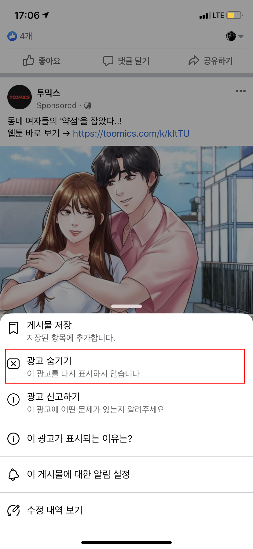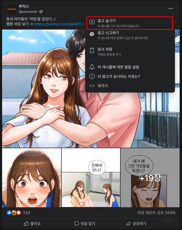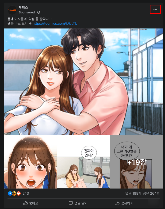 일단 필자의 경우 약간 건전해 보이지 않는(?) 광고글을 하나 차단해보도록 하겠다. '투믹스' 페이지의 광고글을 숨겨볼 예정이다. 일단 투믹스의 게시물을 주목해보자. 그리고 우측 상단의 '점 3개' 버튼이 보일 것이다. 해당 버튼을 탭 해보자.