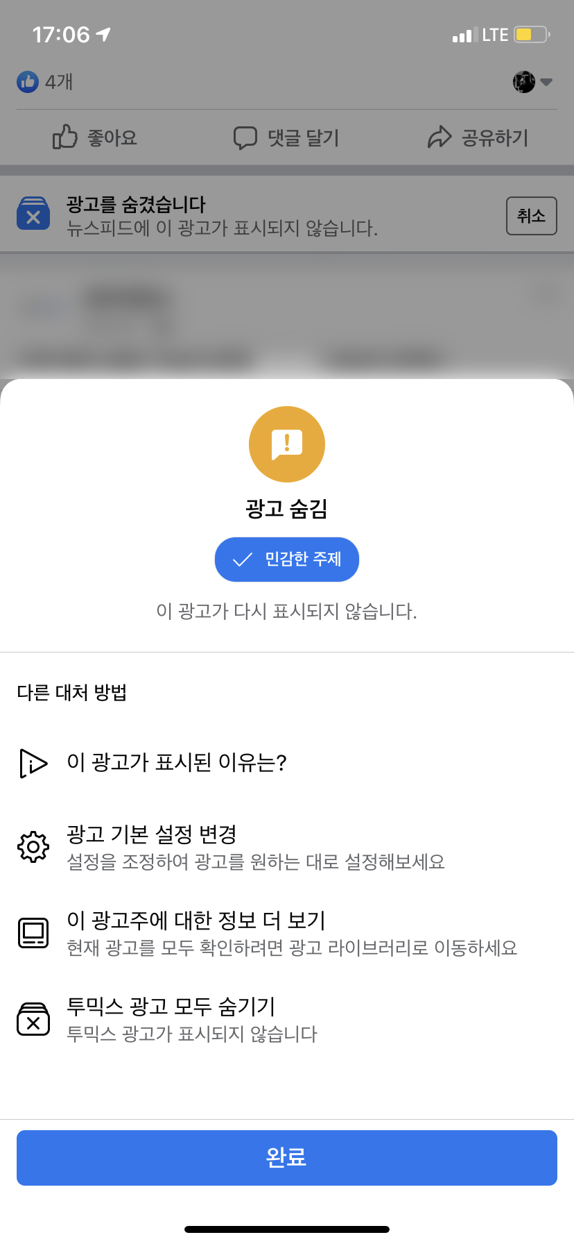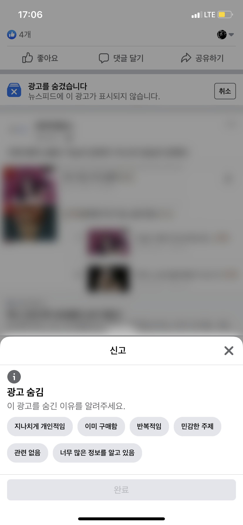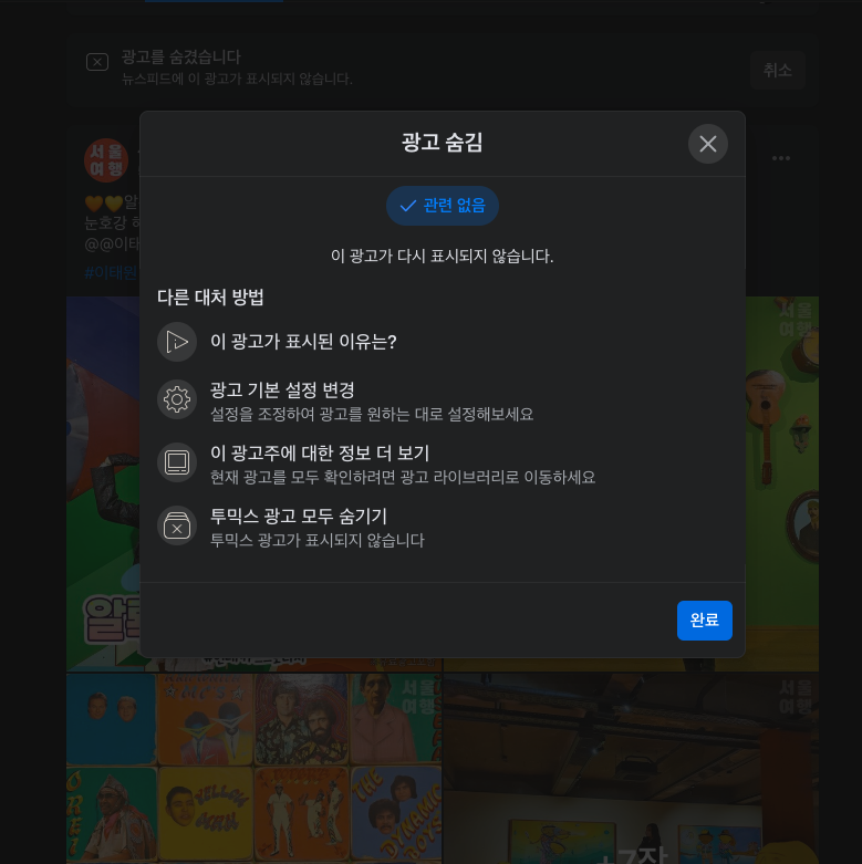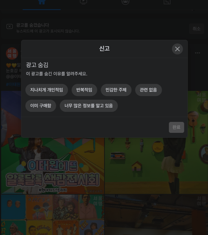그럼 해당 메뉴를 탭 하면, 그 이후에는 이 광고를 왜 숨기려고 하는지 그 이유를 선택하게끔 되어있다. 하지만 광고가 싫은 게 그냥 보기가 싫은 거지 무슨 거창한 이유가 있겠는가. 대충 내용을 선택하고 아래 '완료' 버튼을 탭 해주면 된다. 아무렇게나 한다고 해서 나에게 차단이 안된다는 것은 아니다. 이미 '광고 숨기기' 메뉴를 탭 했을 때부터 광고가 차단되어 있기 때문에 이유를 선택하는 것은 그냥 의미가 크게 없다고 판단하면 된다.