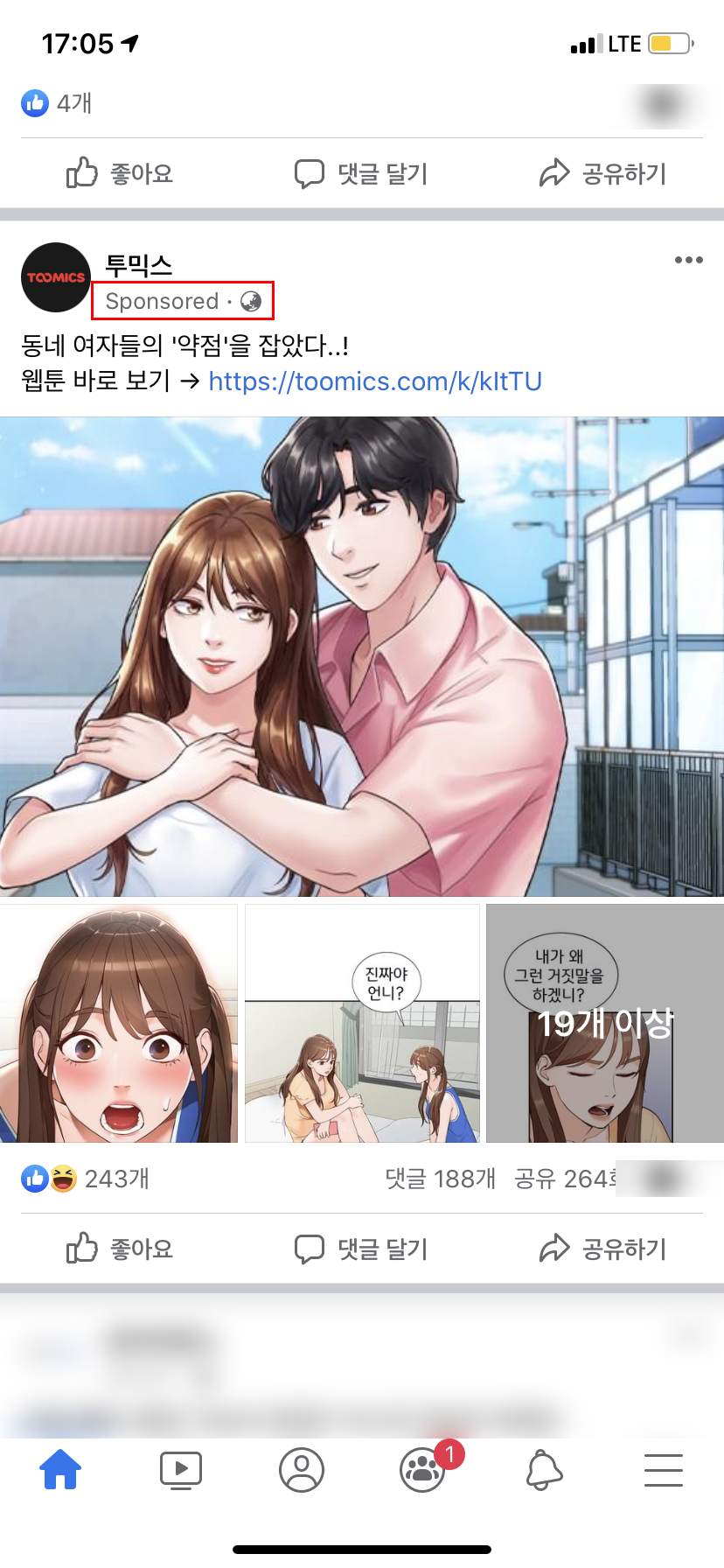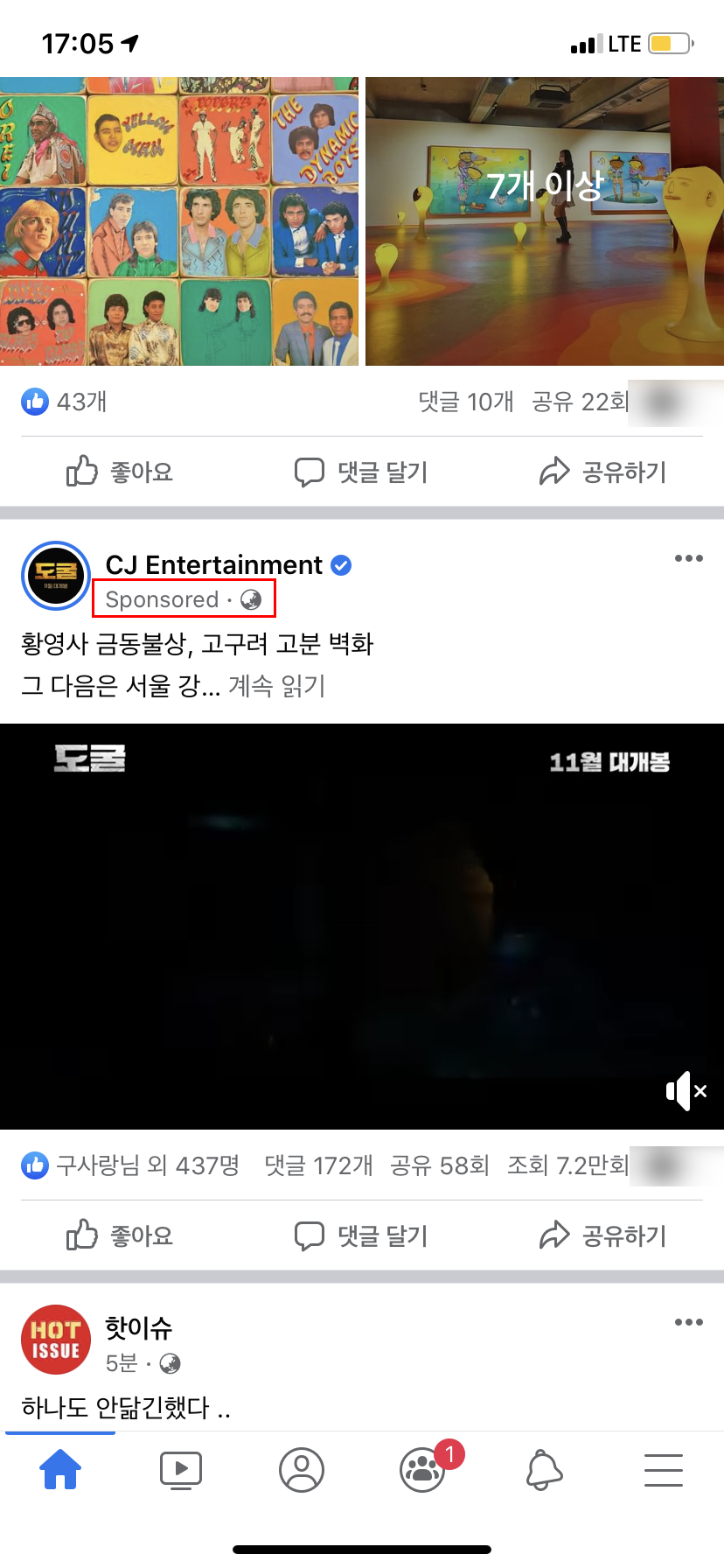 페이스북 어플을 실행하면 내가 팔로우한 페이지나 사람들의 글이 등장한다. 그런데 중간중간에 보면 내가 팔로우하지 않은 페이지가 등장한다. 왼쪽의 경우 CJ Entertainment, 오른쪽의 경우 투믹스라는 페이스북 페이지가 등장한다. 자세히 보면 필자가 표시해둔(빨간색 네모칸) 곳을 주목해보자. 아마 일반 게시물 하고 다른 글씨가 있을 것이다.