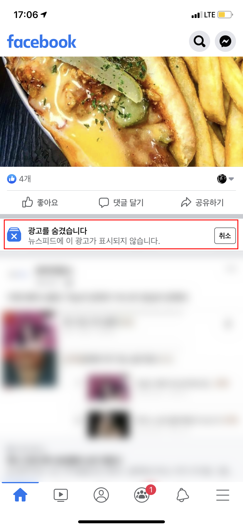 광고 숨김에 대한 사유를 선택하고 '완료' 버튼을 누르면 위와 같이 광고 숨김이 완료되었다는 메시지가 등장한다. 그러고 나서 확인해보면 아까 광고글이 있던 위치에는 '광고를 숨겼습니다.'의 안내문과 함께 더 이상 그 광고가 보이지 않는다. 만약 해당 광고가 당신에게 유익했다고 한다면 우측의 '취소' 버튼을 눌러 광고 숨기기를 해제하면 된다. 이상 모바일에서 페이스북 광고 숨기에 대한 설명을 마친다.