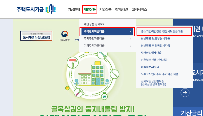 홈페이지에 접속한 후에 우리가 원하는 정보를 찾기 위해서는 해당 관련된 내용이 있는지부터 찾아봐야 할 것이다. 일단 상단의 메뉴바를 주목해보자. '주택도시기금'이라는 로고 옆에 보면 5가지 메뉴가 보일 것인데, 거기서 '개인상품' 메뉴를 클릭해보자.