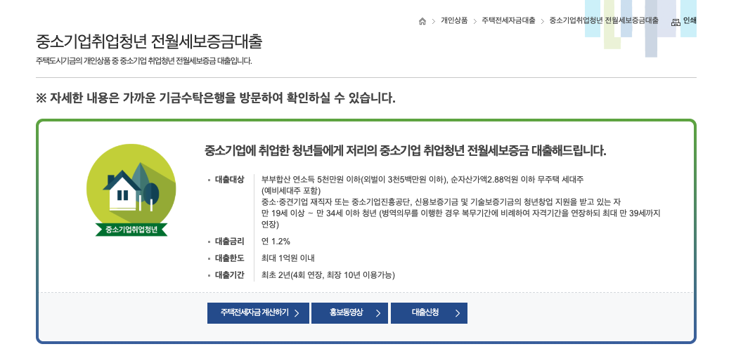 자! 설명하기에 앞서 '중소기업취업청년 전월세보증금대출(이하 중소기업 청년 전세대출)'이란 어떤 대출 상품을 의미하는 것일지 궁금해할 것이다. 중소기업 청년 전세대출이란 말 그대로 중소/중견 기업에 재직중인 34살 이하의 청년을 대상으로 낮은 대출금리를 바탕으로 대출이 가능한 상품이다.