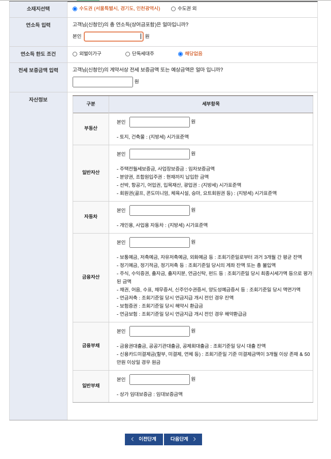 다음 창에서는 연소득과 자신의 자산 정보, 그리고 보증금을 입력하는 창이 나온다. 필자와 같이 미혼인 경우 위와 같이 개인의 정보만 기재하면 되나, 기혼을 경우 자신과 배우자 2명의 자산을 모두 입력해야 한다. 입력을 하고 다음 단계로 넘어가면 유무를 확인해볼 수 있다.