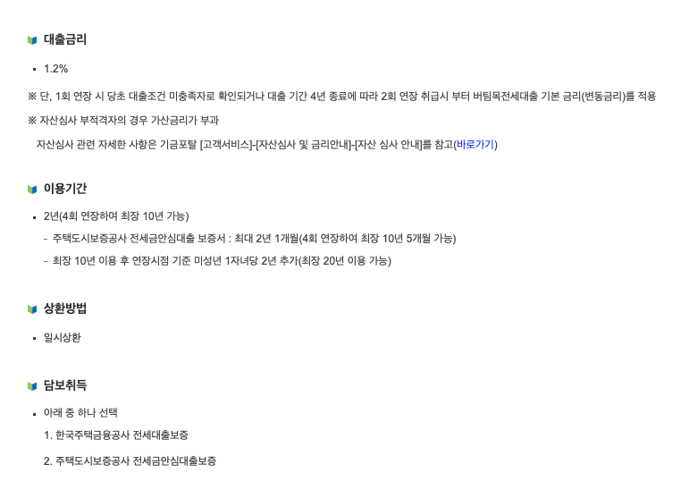 그다음으로 체크할 부분은 대출 금리, 기간 및 연장 방법, 업무 취급은행 등에 대해 알아보자. 일단 대출 금리는 글 맨 처음 부분에서 언급했다시피 1.2% 금리를 갖고 있다. 1억원을 대출했을 경우 내가 갚아야 할 이자는 12만원인 것이다. 정말이지 새삼 보면 볼수록 꿀 대출인 듯하다. 물론 연장이나 기타 이슈가 있을 경우 버팀목 전세대출(2.6~2.8%)의 금리로 전환된다는 점 참고하자.