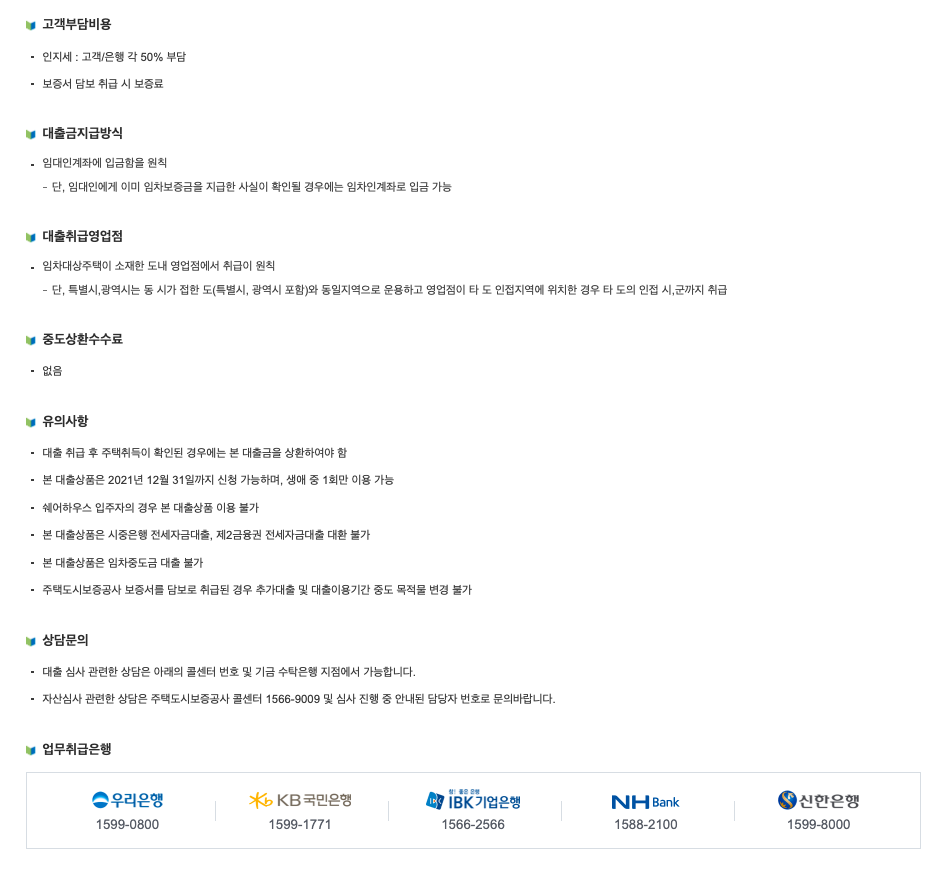 그리고 가장 궁금할 부분은 바로 '한도'일 것이다. 대출 한도는 최대 '1억원'으로 나와 있으며, 100% 비율로 대출이 가능한지, 혹은 80% 비율로 대출이 가능한지로 분류될 수 있다. 이는 융자금이 있는지, 집주인이 해주는지 여부 등에 따라 달라질 수 있는 내용이며, 보통의 경우 대부분 80% 비율로 대출이 가능한 것으로 분류될 수 있다는 점 참고하기 바란다.