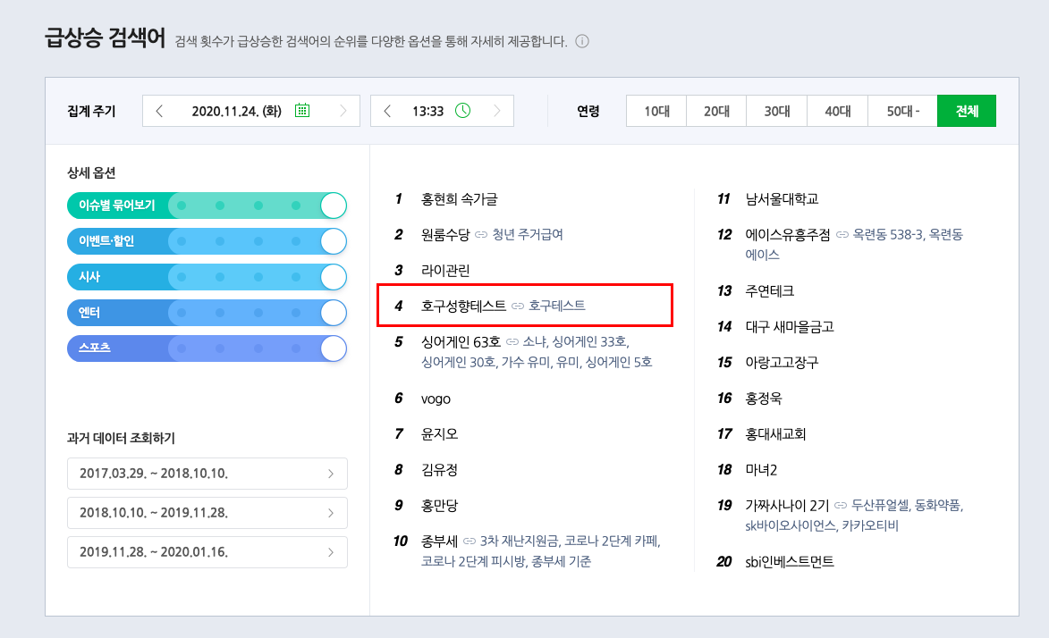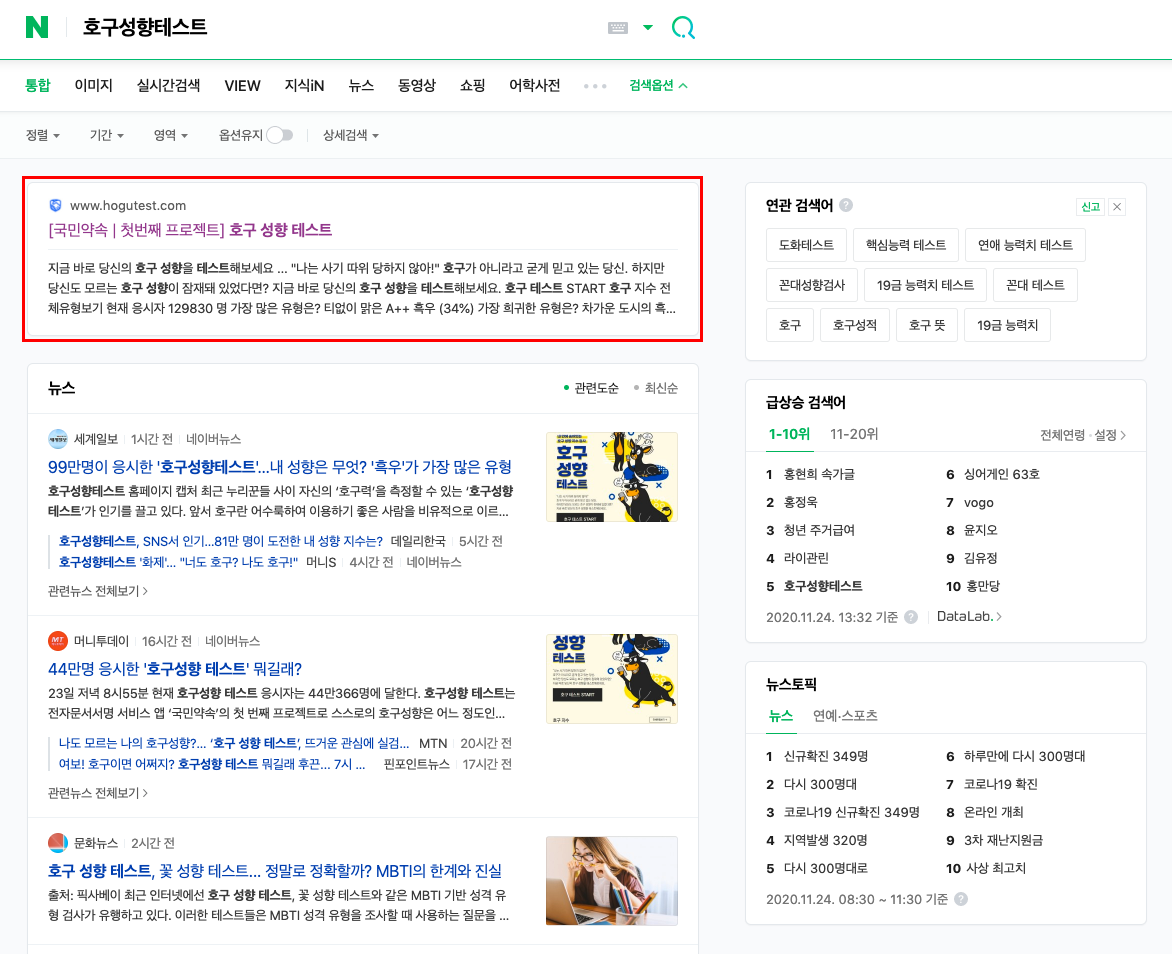 11월 24일 오후 1시 30분 기준 이미 실시간 검색어 4위에 당당히 랭크가 되었다. 실시간 검색어는 다들 알다시피 실시간 유저들이 검색해보는 단어들을 순위별로 매겨놓는 것이다. 이미 4위에 랭크될 정도면 굉장히 핫한 이슈가 아닐까 한다. 인싸들은 이미 이 테스트를 하고 SNS에 결과도 막 공유하고 그러는데, 우리들도 인싸 대열에 한 번 합류해보도록 하자.