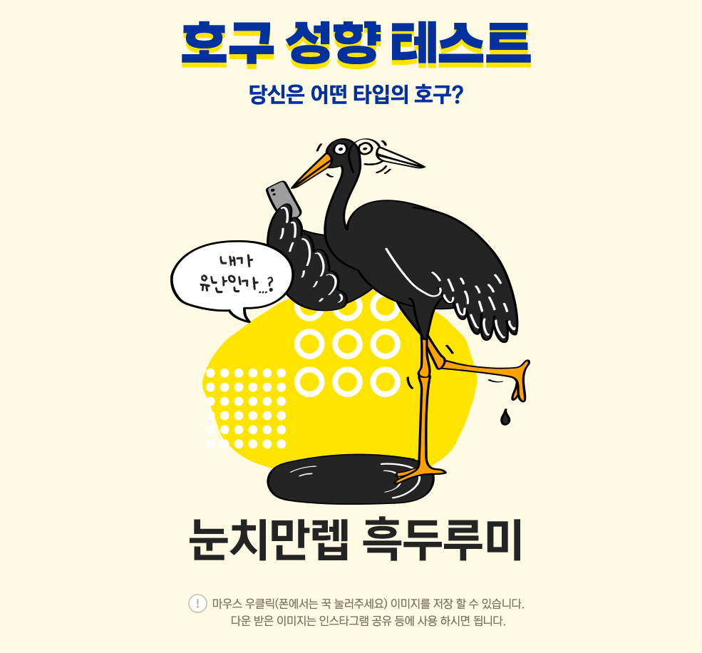 결과도 사람들이 부팅을 많이해서 그런지 꽤 로딩이 걸렸다. 이내 바로 새로고침 한 번 하니 정상적으로 결과가 나타났다. 필자의 호구 테스트 결과는 '눈치만렙 흑두루미'라고 한다. 일단 뭔가 느낌으로는 손해받고 살 느낌은 아닌 듯 하다.