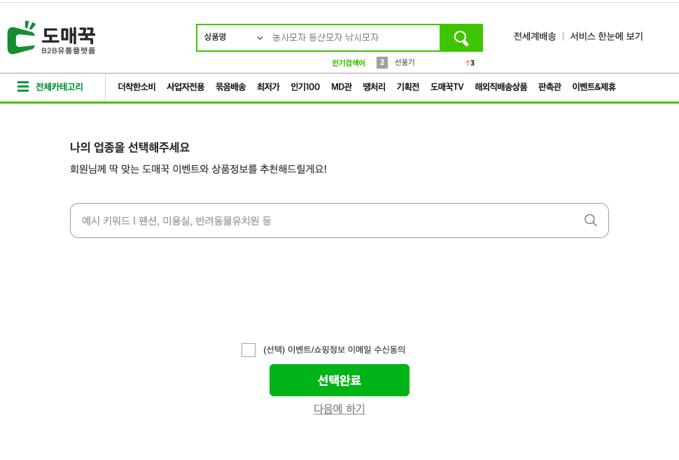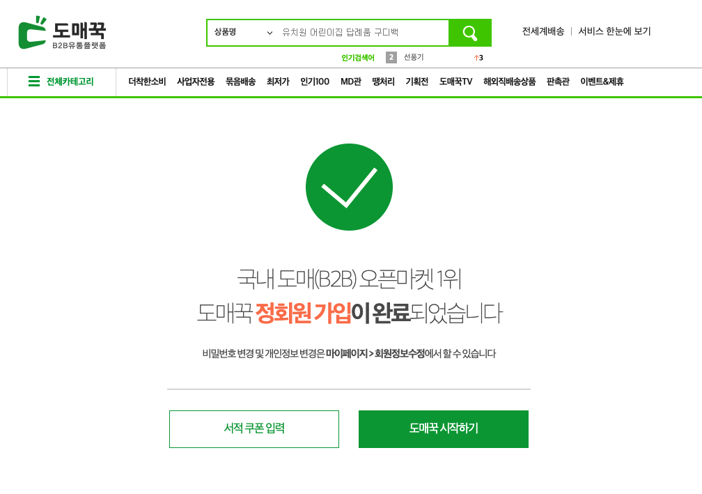 가입이 완료되면 위와 같이 화면이 자동으로 나오게 된다. 눈치채신 분들도 계시겠지만 이렇게 되면 자연스럽게 도매매에서 도매꾹으로 전환이 되어 있을 것인데 무시하면 된다. 추후 가입이 완료되면 하나의 ID로 도매매, 도매꾹 모두 사용이 가능하다.