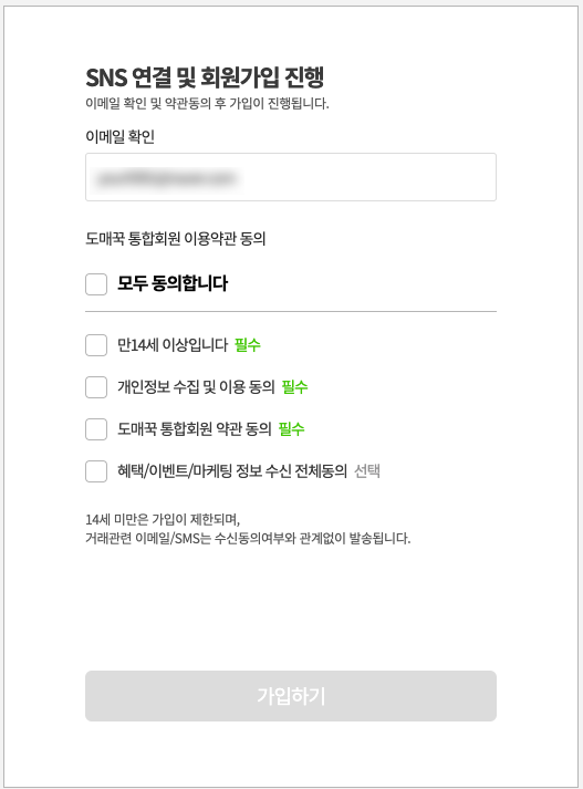 필자의 경우 사업자 전용으로 사용하기 위해 네이버 ID를 사전에 가입해둔 상황이라 네이버 SNS로 회원가입을 하도록 하겠다. 미리 네이버에 로그인을 했다면, 네이버 아이콘을 누르자마자 우측 사진과 같이 나오게 될 것이고 약관에 동의 후 아래의 '가입하기' 버튼만 누르면 가입이 끝난다. 하지만 앞서 언급했다시피 도매매/도매꾹은 준회원 > 일반회원 순으로 가입을 진행하게 된다. 따라서 다음 단계로 일반회원 전환으로 한 번 넘어가 보자.