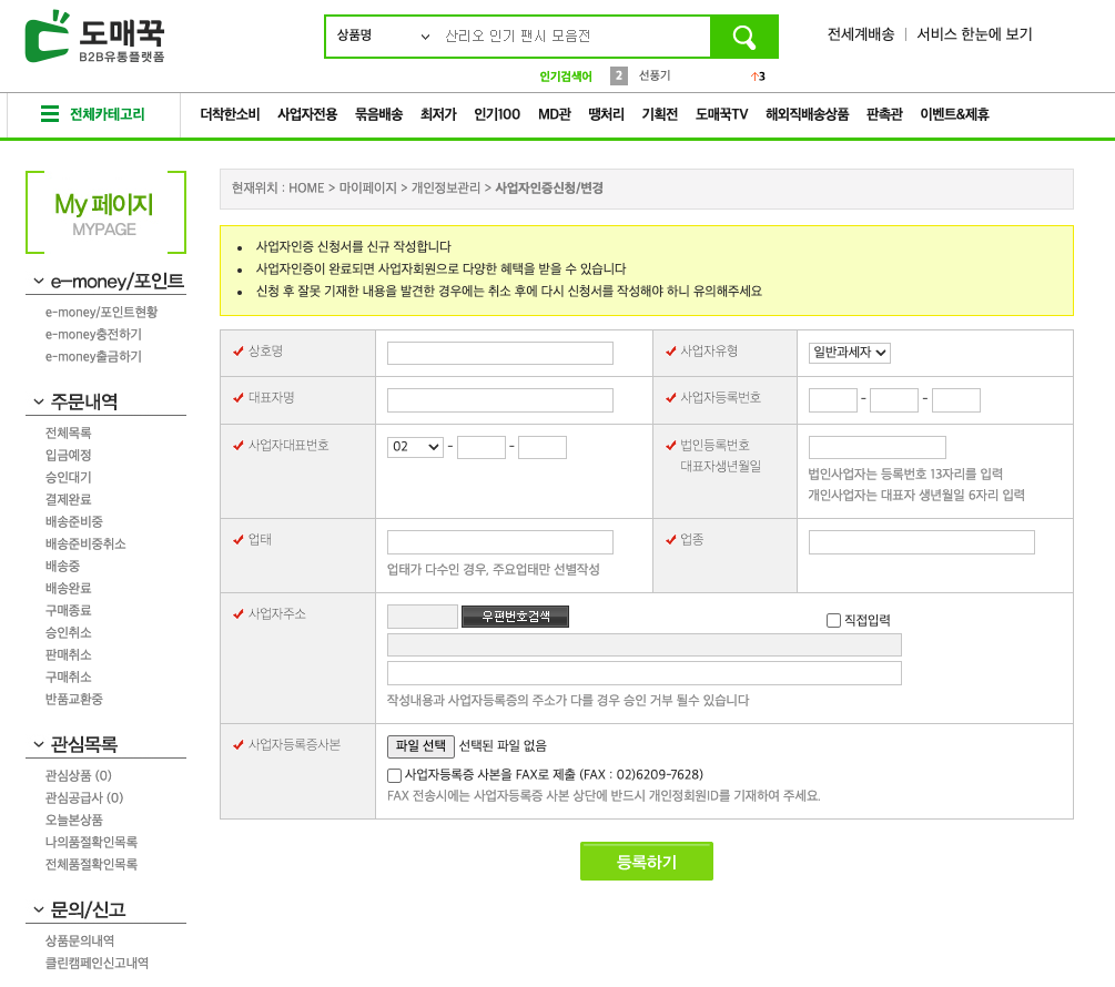 이제 정회원/일반회원으로 가입을 마쳤다면 사업자 회원으로 등록해 보도록 하자. 사업자 회원으로 등록해야 나중에 물건을 소싱하여 구매할 때 세금계산서나 부가세처리를 하기 용이하며, 또 사업자 회원에게만 공급가가 공개되기 때문에 위탁/사입 판매자로서는 필수적인 과정이라고 보면 된다.