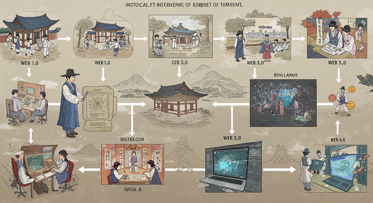 | Web1.0 | 1990년대~ 2000년대 초 | 정적 웹페이지, 일방향 정보 제공 | 야후, 네트스케이프 | 정보 소비자(읽기) |