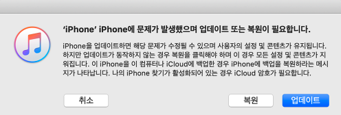 위 과정을 거친 후에 컴퓨터 화면을 보자. 아이튠즈에서 다음과 같이 복원/업데이트 옵션이 표시된 창이 뜬다. 업데이트는 iOS 최신 버전으로 업데이트해주는 것인데 우리의 경우 무한부팅으로 인해 공장초기화가 목적이니 가뿐히 무시하고 '복원'을 눌러준다.