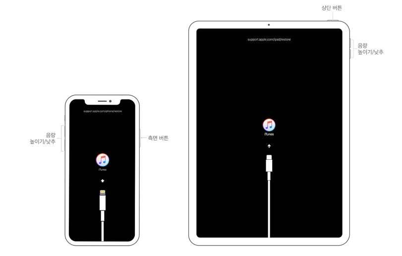 즉 다시 정리하자면 선을 연결한 후 강제 종료 버튼을 누르면 종료화면이 뜬다. (이미 종료된 상태라면 이 단계는 건너뛴다.) 이후에 계속 강제 종료 버튼을 누르고 있으면 위 사진에 있는 화면처럼 아이튠즈에 연결되었다는 표시가 뜬다.