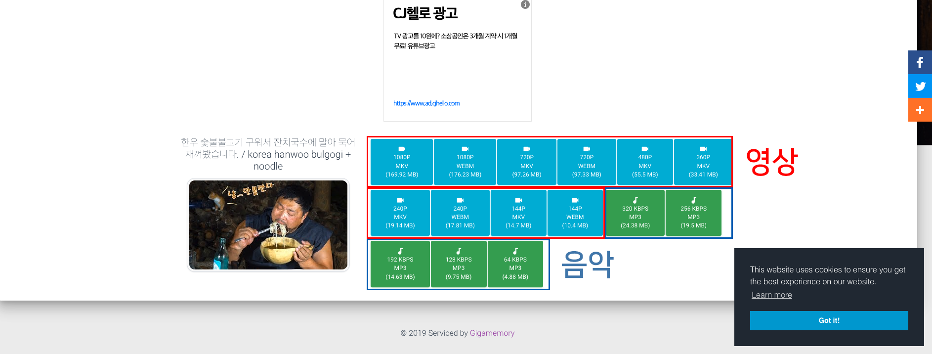 로딩이 끝나면 위와 같이 영상(빨간색 네모칸)과 mp3 음원(파란색 네모칸)의 선택지가 등장하게 된다. 여기서 자신이 원하는 것을 선택하고, 그 칸을 눌러주면 된다.