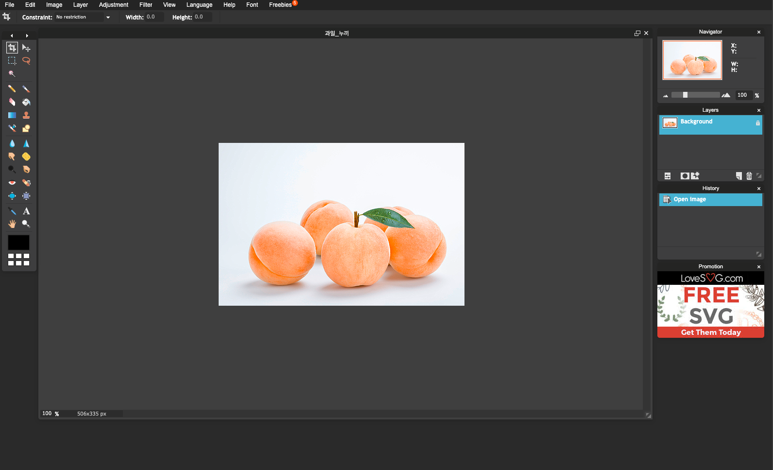 안내 문구는 번역하면 다음과 같다. 일단 필자의 경우 여러분들에게 이 무료 포토샵 사이트를 이용해서 누끼따기까지 보여주고자 한다. 따라서 미리 필자가 다운로드 한 파일(우측 사진의 '과일_누끼.png' 파일)이 있으니 2번째 안내문구를 선택했다. 여러분들은 여러분들 상황에 맞는 것을 선택하여 이용하면 된다.