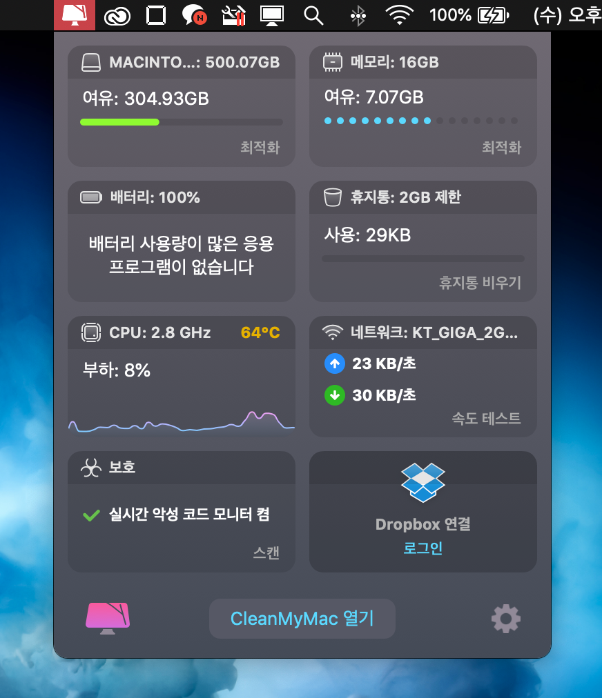 필자가 개인적으로 마음에 드는 것은 CPU 온도가 나오는 것과 RAM 용량 및 정리를 할 수 있는 기능이 있다는 것인데, 컴퓨터 작업을 하면서 갑자기 느려지거나, 버퍼링이 많이 걸릴 때 RAM 정리와 더불어 용량 정리도 수시로 해주면 그러한 현상이 조금은 나아지는 경우가 많았다. 일단 상단 메뉴바에 아이콘으로 수시로 상황을 체크할 수 있다는 점이 굉장히 편리한 어플인 거 같다. 게다가 악성 바이러스가 침투하지 못하도록 실시간 감시도 하고 있으니 이 얼마나 안전한 프로그램인가! 매우 만족하면서 지금까지 잘쓰고 있다.