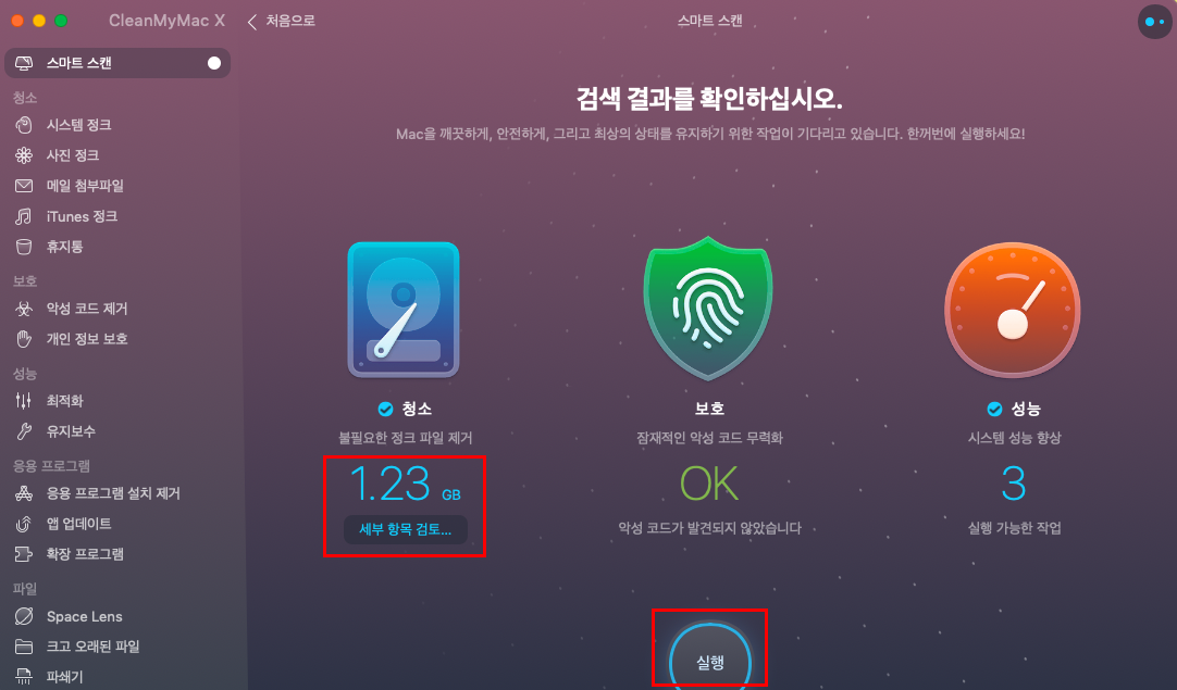 완료 후에는 아래 '실행' 버튼을 누르면 삭제/정리 작업이 진행된다.