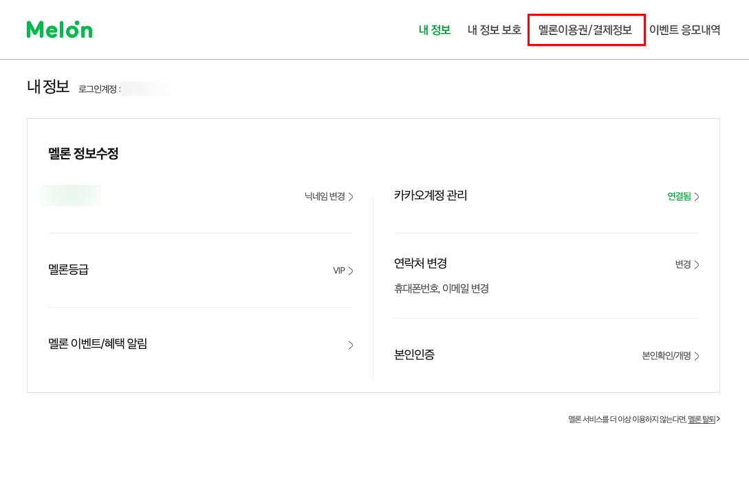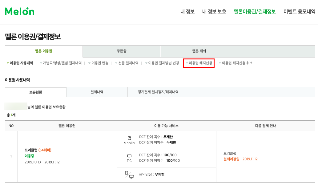 여기서 우측 상단에 보면 4개의 메뉴가 있을 것이다. 그 중 '멜론이용권/결제정보' 메뉴가 있는데 딱 봐도 무엇을 의미하는지 대강의 감이 온다. 게다가 우리의 목적과 굉장히 닮은 구석이 많은 친구니까 서둘러 해당 메뉴를 탭 해주도록 하자.