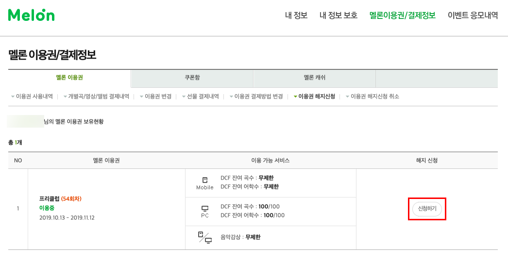 그럼 아까와 동일한 화면이 나올 것이다. 하지만 딱 한 가지 다른 점이 있다. 바로 제일 오른쪽에 '해지 신청' 메뉴 아래 '신청하기' 버튼이 생긴 것! 그렇다. 이것만 눌러주면 멜론 플레이어 이용권 해지 PC버전은 마무리되는 것이다. 편-안하게 눌러보자.