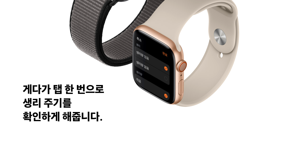 네 번째 기능은 여성분들을 위한 기능이라고 할 수 있겠다. 바로 '생리 주기'를 탭 한 번으로 확인이 가능하다는 점이다. 이것은 아이폰11 시리즈와도 연동이 될 수 있는 부분인 거 같다. 생리 주기뿐 만 아니라 개인의 건강과 관련된 내용들을 건강 어플에서 체계적으로 관리할 수 있으며 아이폰11과 애플워치5 간에 연동을 통해 훨씬 더 효과적으로 어플을 이용할 수 있지 않을까 싶다.