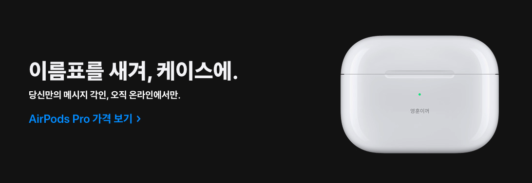 마지막으로 무료 각인 서비스가 제공된다. 각인 서비스란 에어팟 충전 케이스에 자신의 이름 / 번호를 기입하여 자신의 것임을 증명할 수 있는, 쉽게 말해 자신의 물건에 자신의 이름을 새겨 넣는 것이다. 원래 각인 서비스는 돈을 지불하고 서비스를 받을 수 있으나, 에어팟 프로 구매시 무료로 각인이 가능하다고 하니 참고하자!