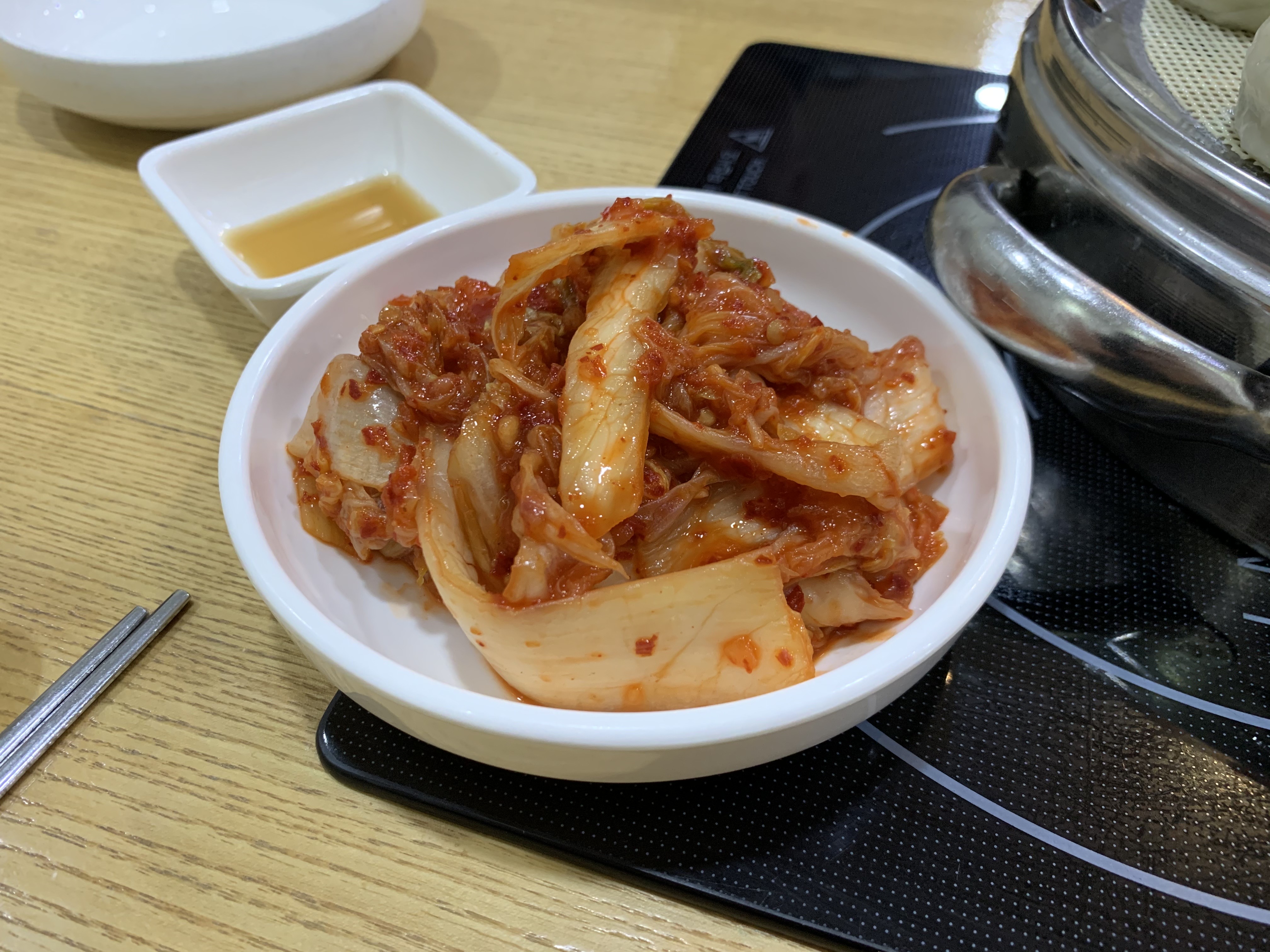 가장 먼저 항아리(?)에 담겨있는 김치를 덜어내보자. 여기는 기본적으로 책상에 김치가 담긴 항아리가 세팅되어 있다. 자신이 먹을 만큼의 김치를 덜어가면 되는 매우 효율적인 시스템인 거 같다.
