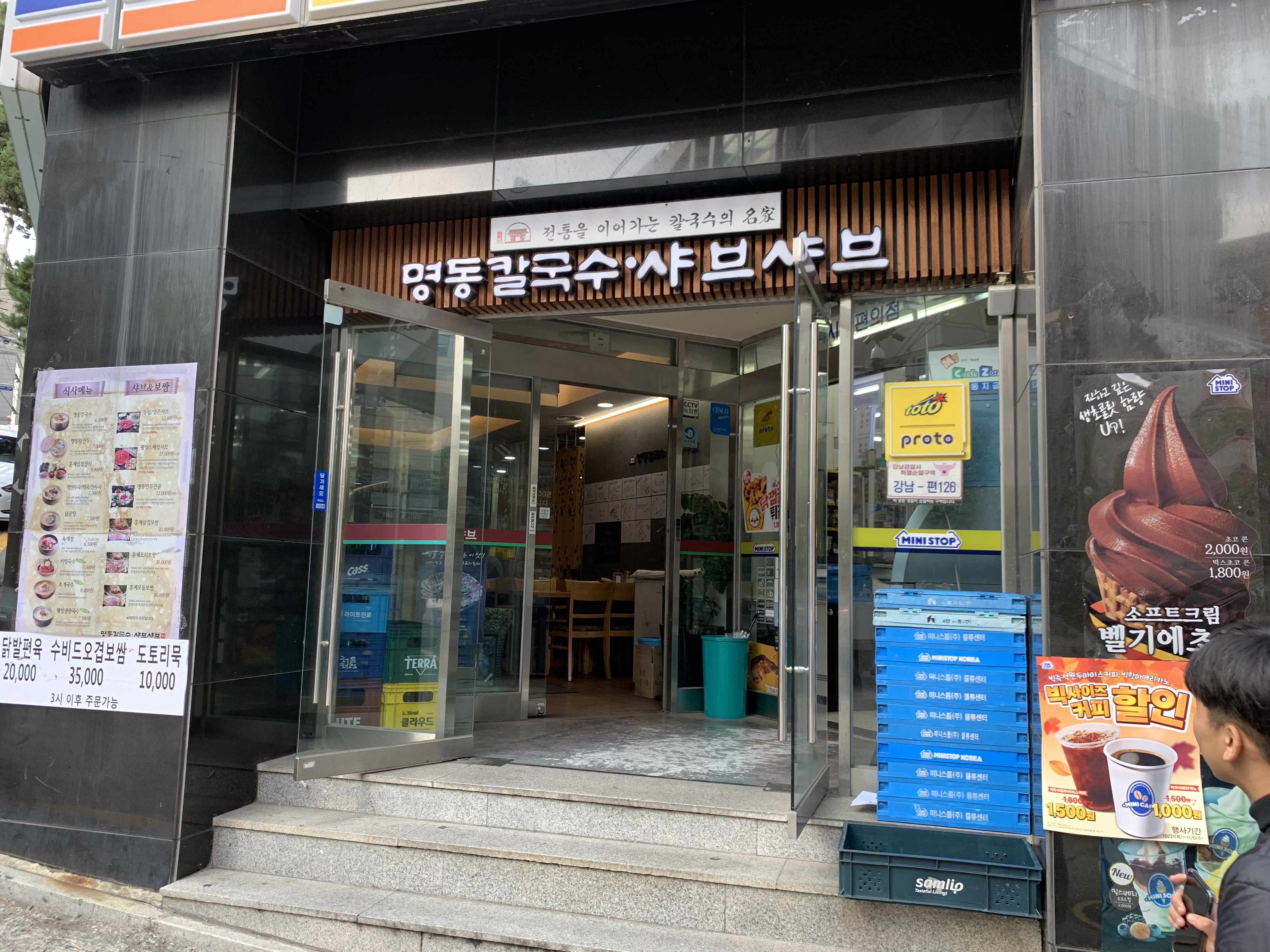 위치는 선정릉역 2번 출구로 나와 도보로 3-5분 정도만 걸으면 나온다. 일단 간판이 대문짝만 하게 걸려 있기에 찾는데 어렵지는 않을 것이다. 일단 외관만 보면 일반 음식점과 별반 차이가 없어 보인다. 다만 조금 특이한 것은 명동칼국수 바로 옆에 미니스톱 편의점이 있다. 그래서 여담이지만 회사 사람들하고 점심을 먹고 나오면서 아이스크림과 같은 후식 내기를 종종 한다. 명동칼국수 바로 옆에 미니스톱이 있으니 미니스톱 아이스크림이 또 맛집이라 점심과 후식 두마리 토끼를 잡을 수 있는 스근한 곳인 거 같다.