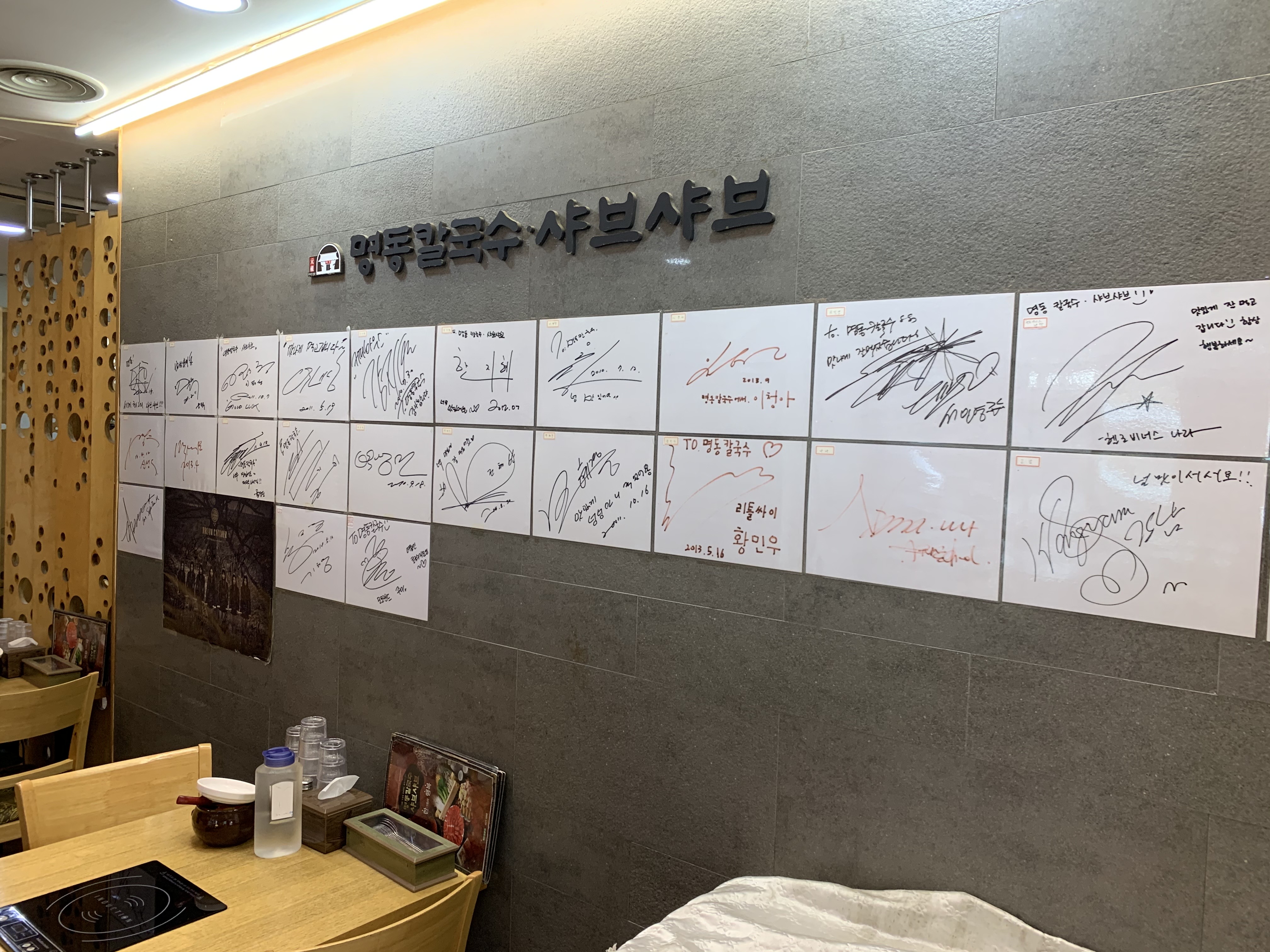 들어서자마자 눈에 띄는 것은 유명인들이 직접 방문한 인증 싸인(?)이다. 뭐 누가 왔는지는 구체적으로 살펴보진 않았지만 굉장히 많은 분들이 다녀간 듯 하다. 그리고 한쪽 벽면에는 명동칼국수 샤브샤브 음식점에 대한 설명이 나와있으며, 원산지 표시판도 보인다. 대부분 국내산을 사용하는 듯 하니 나름 믿을 수 있지 않을까 싶다.